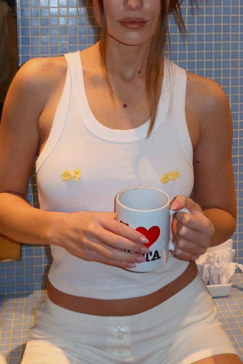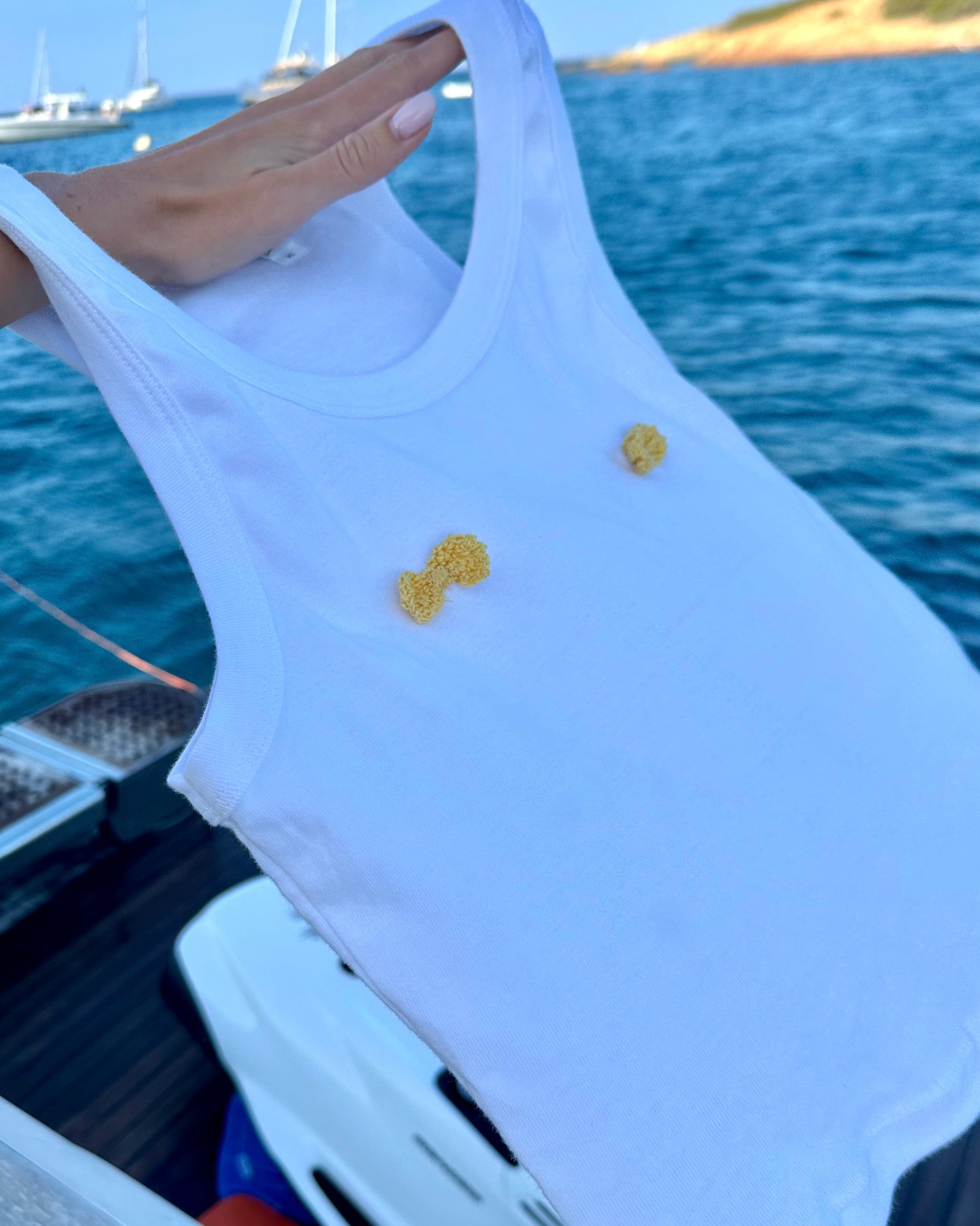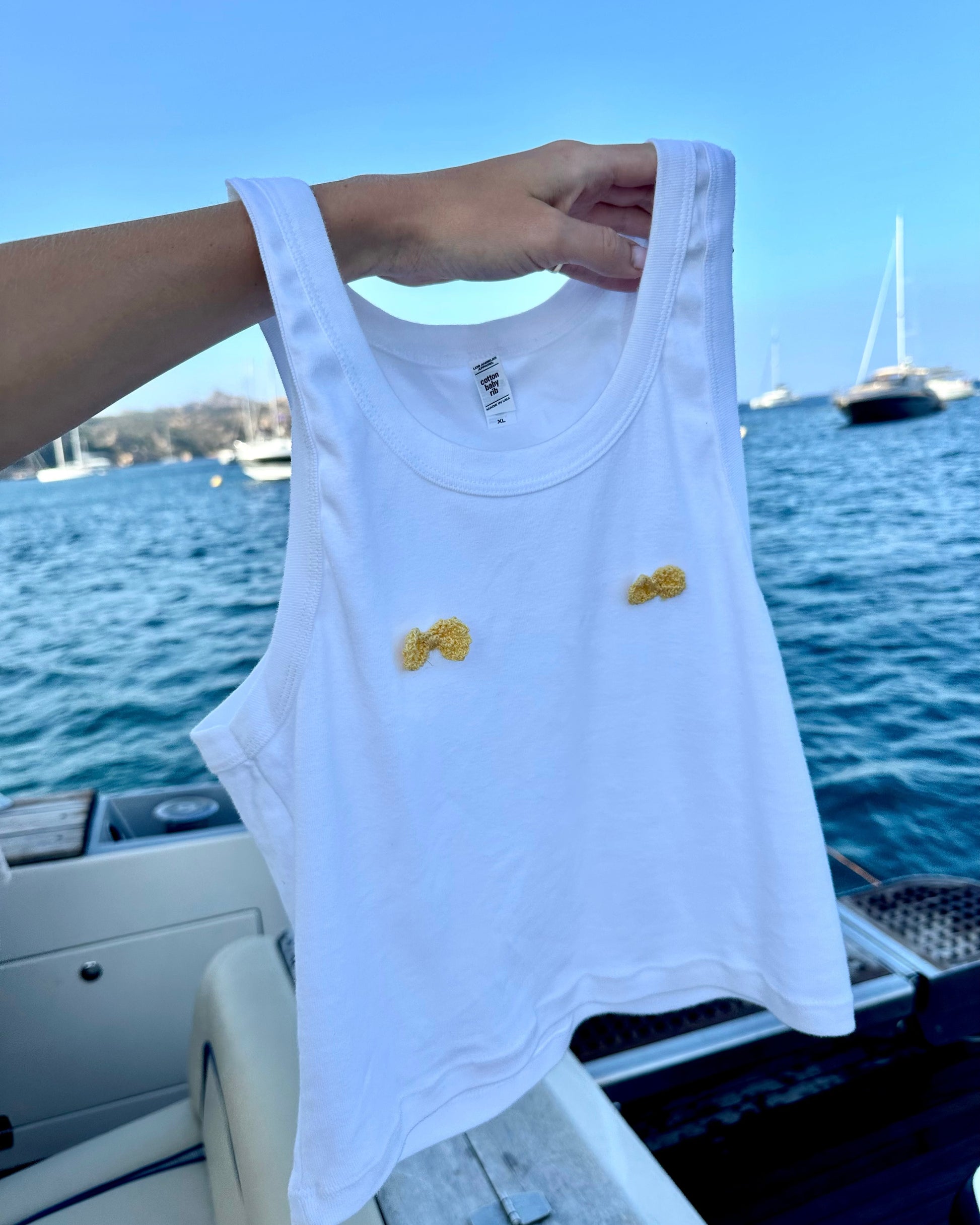 100% Cotton Tank Tops with Sewn-In Crochet Bow Ties- Made from soft 100% cotton, they offer a relaxed and comfortable fit.